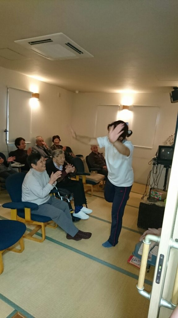 この日もカラオケ室からフロアまで賑やかな声が聞こえて来たので覗くと、利用者様全員での合唱でスタッフが踊ってます!
