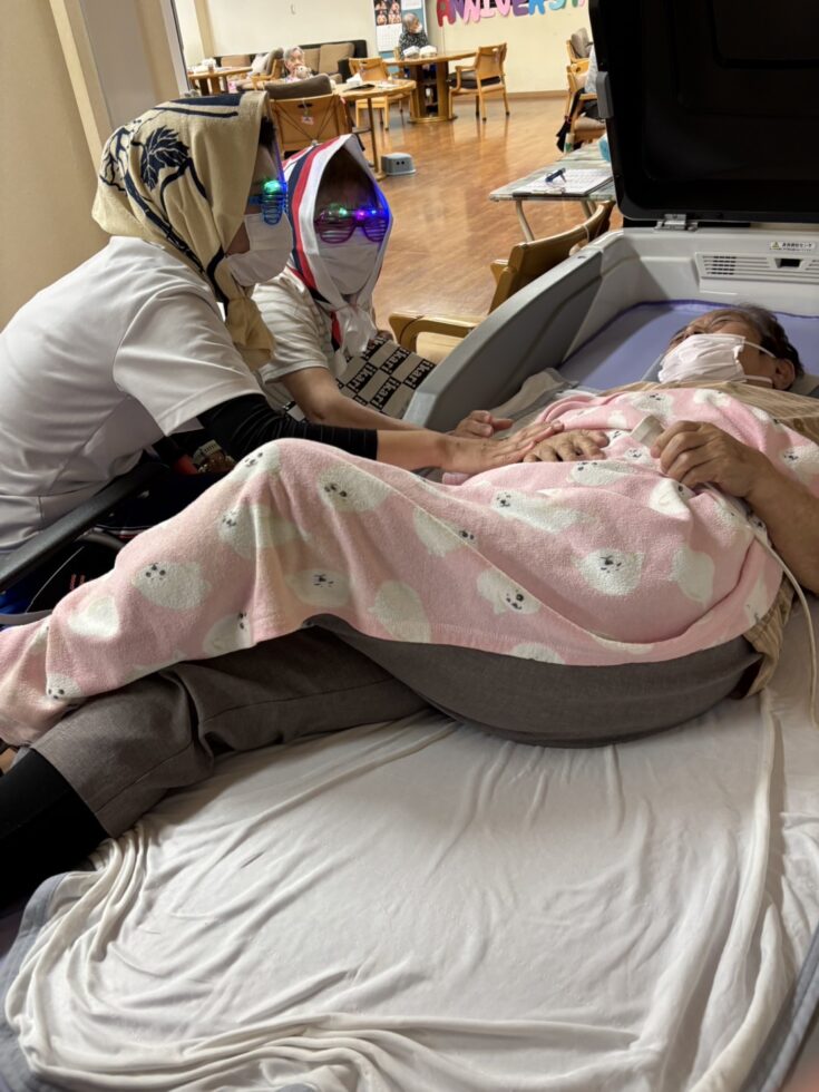 気を良くした私たちは次にウォーターベッドに寝ておられたご利用者様にちょっかい出しまくり。