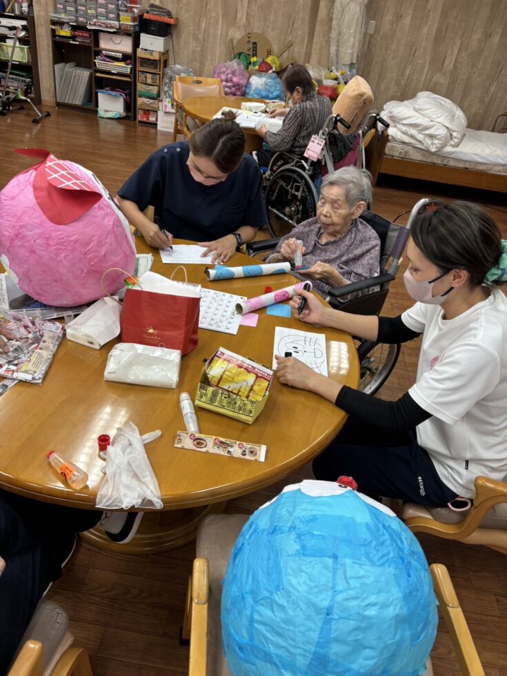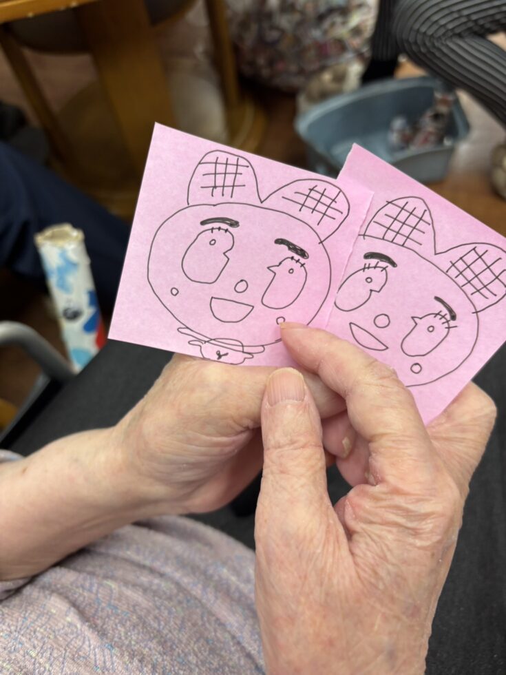 彼女たちの間に挟まるご利用者様は出来上がった絵を見る度に頭を抱えられたり、口元を手で隠し必死に笑いをこらえておられます。