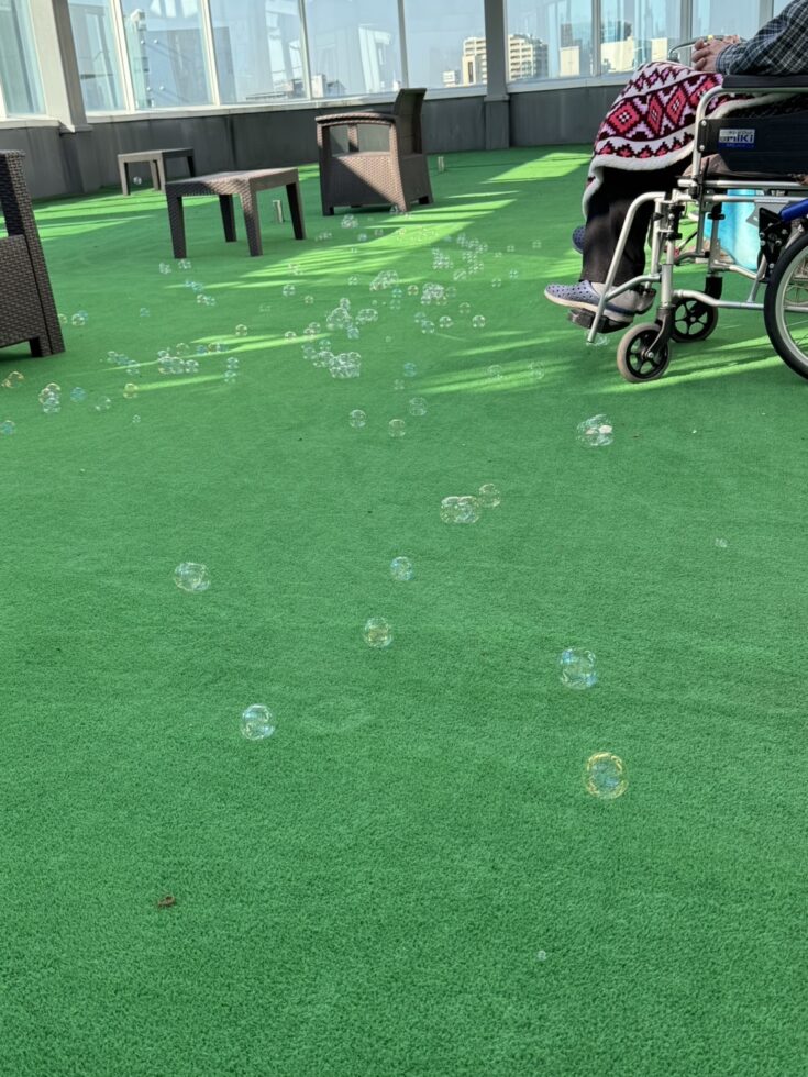 芝生とシャボン玉のコントラスト、なかなか綺麗ですよ✨