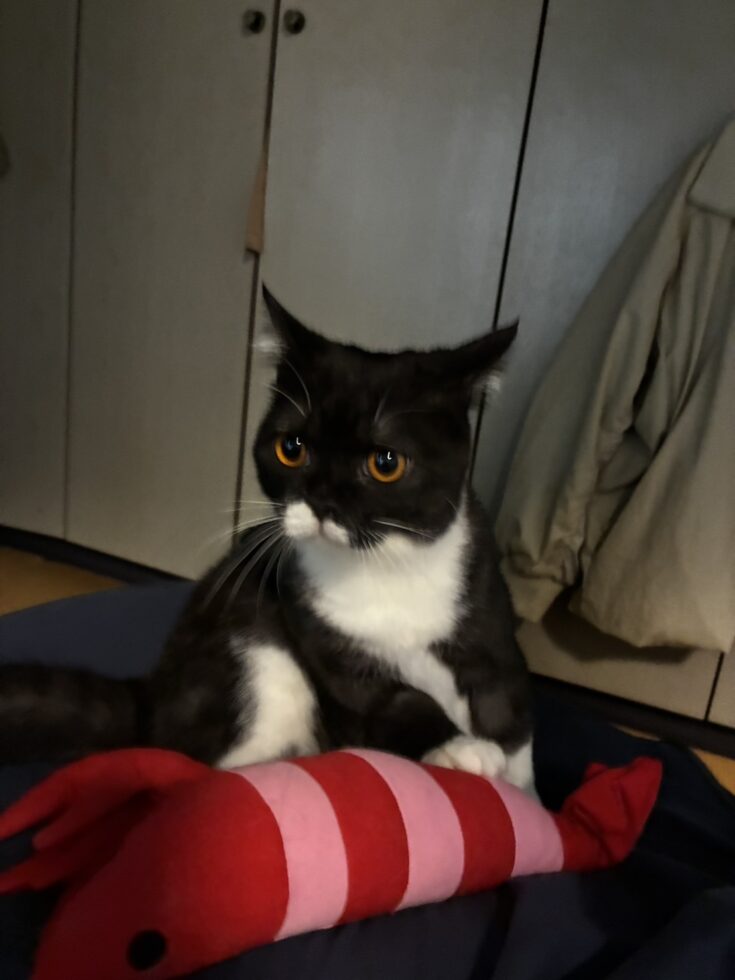 マンチカンなのに足が長いタイプだったので、家族の縁がなかなか無かったようでペットショップで生後6か月まで大きくなっていた子でした。